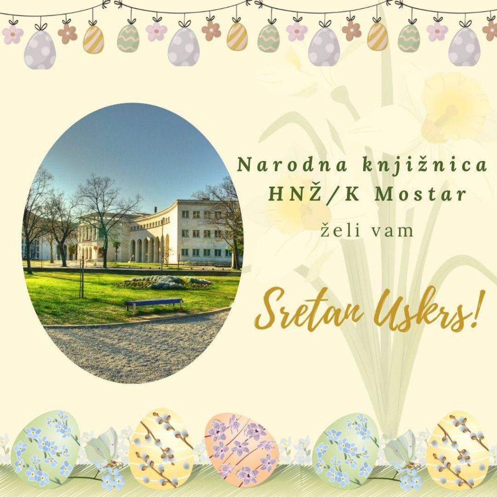 Sretan i blagoslovljen Uskrs članovima i korisnicima knjižnice te suradnicima žele djelatnici Narodne knjižnice HNŽ/K Mostar!